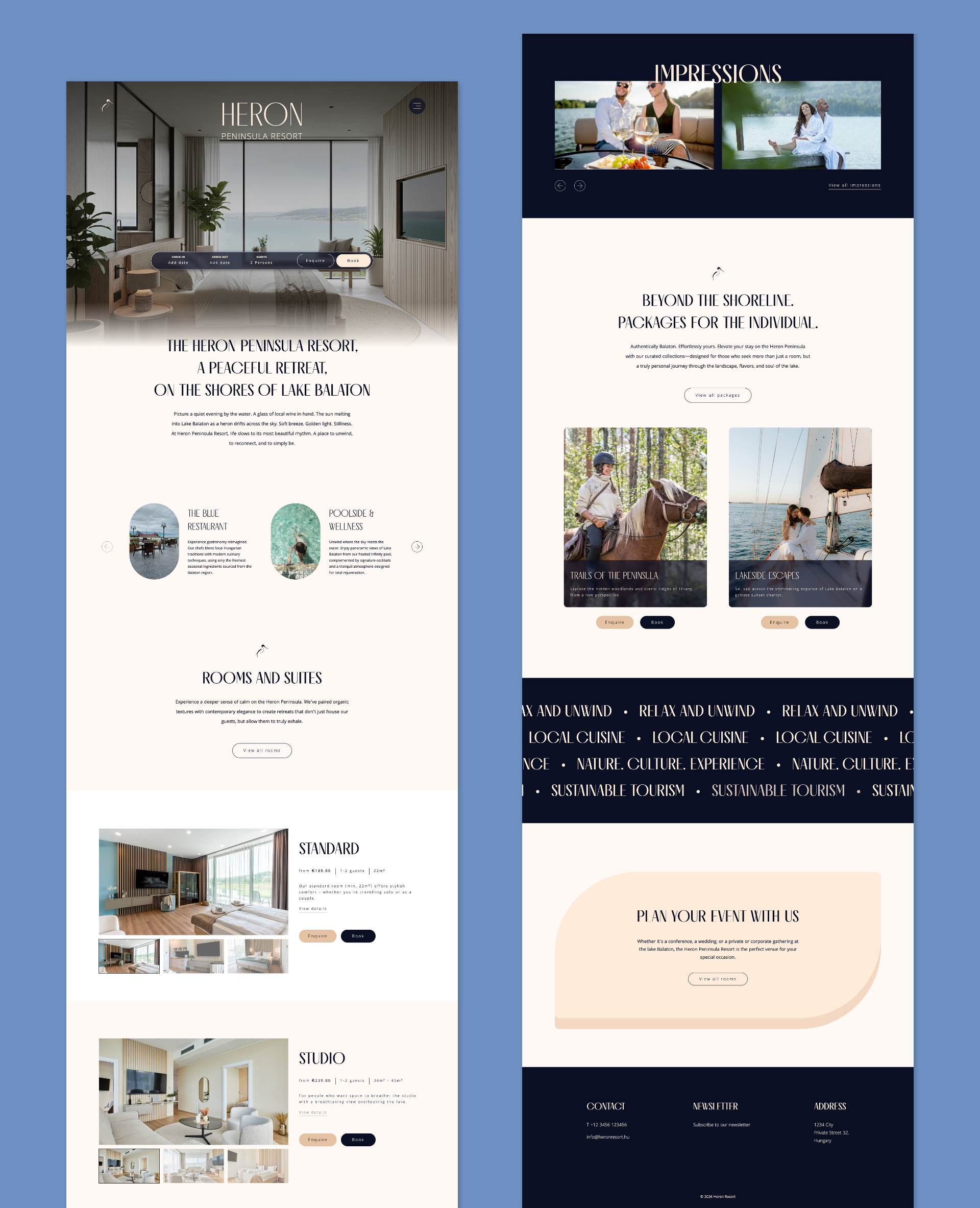 Heron Peninsula Resort. Homepage design for a conceptual luxury hotel on the shores of Lake Balaton.